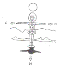 Al mediodía, en cualquier mes del año, el Sol nos indicará la dirección Norte-Sur. Pero ¡ojo! La hora solar no se corresponde con la hora oficial, en verano tendremos que retrasar el reloj 2 horas y 1 hora en invierno para igualarlas. A las 12 horas solares si nos situamos de espalda al Sol, nuestra sombra marcará la dirección Norte-Sur, con el Sur a la espalda y el Norte al frente. Si abrimos los brazos horizontalmente ya tenemos también el Este y el Oeste (ver gráfico 2).