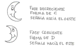 Gráfico 5. Método de orientación por las estrellasLas fases lunares, para diferenciar las fases lunares recordaremos aquello de que la luna es una mentirosa; así cuando tiene forma de C, decrece (cuarto menguante), y cuando tiene forma de D, Crece (cuarto creciente). Esta regla también es válida para orientarse.
