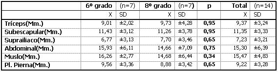 Tabla II. Pliegues cutáneos. Los datos presentan media y desviación típica. *p<0,05