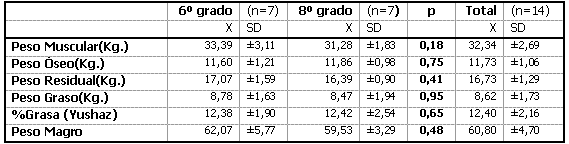 En conclusión, los resultados de este estudio muestran que las medidas antropométricas no determinan ni predicen el rendimiento. No se han encontrado diferencias significativas entre octavo gradistas y sexto gradistas en ninguna variable que nos lleve a pensar que puedan influir en un mayor rendimiento.