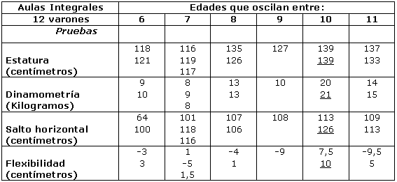 Tabla N° 7. Valores medidos en la batería de cuatro test (estatura, dinamometría, salto horizontal, flexibilidad) aplicados a los niños de aulas integrales, cuyos resultados se encuentran ubicados de acuerdo a la edad del evaluado.Lipometría (pliegue subcutáneo del tríceps, pliegue subescapular): En este pliegue, se hallaron valores más altos a la edad de 11 años con 12 mm en pliegue subcutáneo del tríceps y 9 mm en pliegue subescapular. Entre los otros grupos evaluados, las diferencias son inferiores, con la particularidad de que el pliegue que presenta el valor más bajo se encuentra en el grupo etario de 7 años con 7 mm en pliegue subcutáneo del tríceps y 5,6 mm en pliegue subescapular.