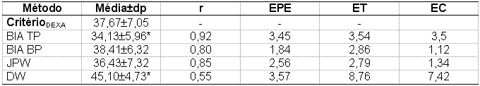 As estimativas realizadas pela equação de Durnin e Womersley (1974) (DW) para o somatório de quatro dobras cutâneas e o modelo de BIA tetrapolar (BIA TP), apresentaram diferença estatisticamente significativa (p < 0,05) com a medida critério (DEXA). Por outro lado, a equação desenvolvida por Jackson et al. (1980) (JPW) para soma de três dobras cutâneas e o modelo de BIA Bipolar (BIA BP) estimaram a medida critério com acuracidade (p < 0,05).