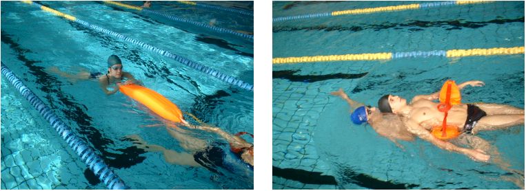 Fotos 7 y 8: Utilizaremos todo aquel material que nos facilite y permita realizar un rescate. Los materiales debemos conocerlos y saber utilizarlos, solo así podremos sacarles el máximo rendimiento en nuestras acciones.Sesión 5: El remolque en el salvamento ¿Qué es?, ¿Cómo puedo utilizar la ropa en un rescate? Explorar y desarrollar las principales técnicas de remolque.