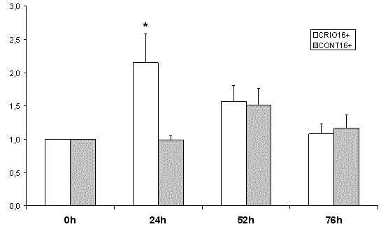 A mesma cinética de aparecimento de CK ocorreu com CRIO16+ (n = 6). A concentração de CK aumentou 2,2 vezes 24h após o CCVV (p<0,05). As concentrações das dosagens subseqüentes e as concentrações do grupo CONT16+ mantiveram-se em patamares idênticos a 0h (Figura 4).