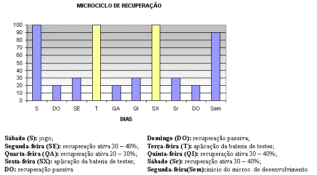 Figura 1 - Exemplo de um microciclo de recuperação e de controle para a aplicação da bateria de testes.Foram aplicados um total de 68 (sessenta e oito) sessões de treinamento divididas da seguinte forma: