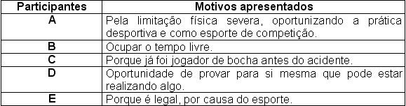 Resultados e discussãoQuando questionamos o porquê da escolha do bocha adaptado, os participantes mencionaram diferentes motivos, como podemos verificar no quadro1.