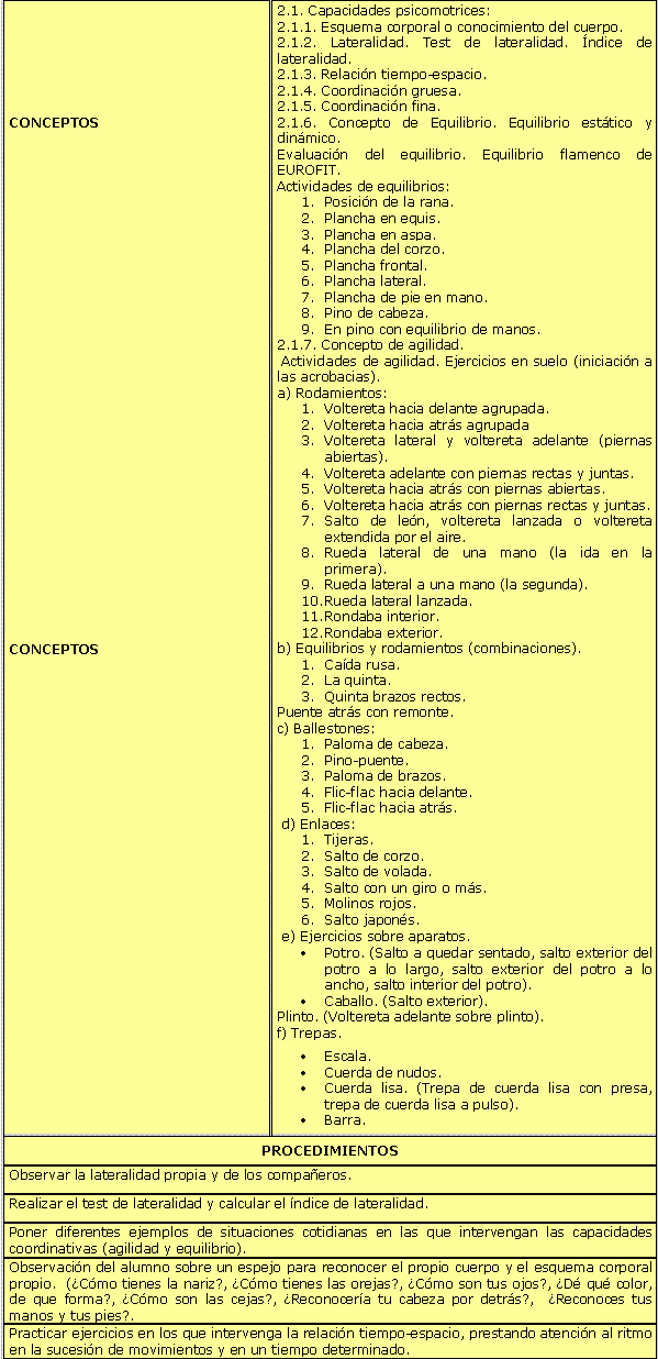 A continuación se presenta una sencilla secuenciación de contenidos, adaptada del libro de texto de Martínez de Haro (2004), correspondientes al bloque de Habilidades Específicas. Hemos preferido estructurar varias unidades didácticas, esquematizando los aspectos más relevantes, de forma que el profesorado pueda profundizar en los contenidos que desee. Igualmente se ha considerado prioritario facilitar al docente la elaboración de un cuadro de seguimiento; sobre todo, teniendo en cuenta la tendencia actual de programar cada paso del proceso educativo, así como su posterior comprobación, debiendo reflejar por escrito las incidencias ocurridas en el transcurso de cada clase. Este proceso se hace más exigente cada vez, no en vano ya han comenzado algunos centros a perfeccionar su proceso educativo con objetivo de obtener el sello de control de calidad educativa por empresas cualificadas como AENOR.