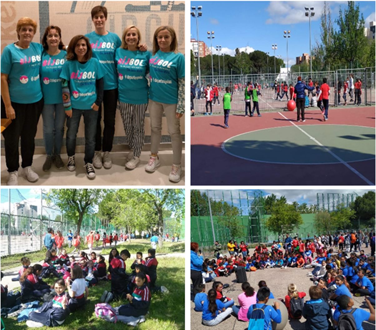 Tere Miña Encinas, como autora y creadora del Bíjbol coordinó un Seminario sobre Bíjbol cuyo colofón serían unas jornadas en la que participaran los alumnos de los profesores asistentes. Formaron un equipo de 6 profesoras. Gracias al empeño e ilusión de sus compañeras celebran las Jornadas de Bíjbol de Madrid en el polideportivo de Aluche. Tiene cinco pistas y les acogen estupendamente. A finales de abril, en jornada de mañana, se juntan cuatro centros de Educación Primaria, alumnado de 5º y 6º, y un Instituto, de 1º y 2º. Establecen los horarios y la ubicación. Cada grupo sabe dónde y a qué hora participa. No está pensado como una competición. Juegan, cuando no, son espectadores activos, animan, se relacionan con otros de su edad, comparten vivencias. Cada partido (también en sus clases) acaba con una consigna, un saludo: “Buen partido”. Al finalizar comparten una ceremonia de clausura en la que les agradecen su participación, les felicitan por su buen comportamiento, les entregan un diploma, les emplazan para la próxima edición y bailan una misma coreografía que han preparado anteriormente cada profesora con su alumnado. Es espectacular y muy emocionante ver 400 chicos y chicas jugando a un mismo juego y bailando al son de un mismo himno.
