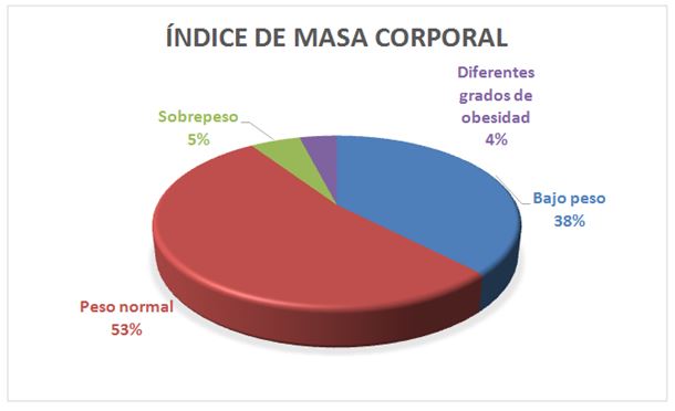 En la Tabla 1 y la Figura 1 se muestra respectivamente la distribución en número de sujetos y porcentaje de los valores obtenidos en un total de 376 niños evaluados en peso y talla. Posteriormente estos valores fueron clasificados según su IMC mediante el índice Quetelet y distribuidos de la siguiente manera: 142 sujetos (38%) bajo peso, 199 (53%) peso normal, 20 (5%) sobrepeso y 15 (4%) con diversos grados de obesidad.